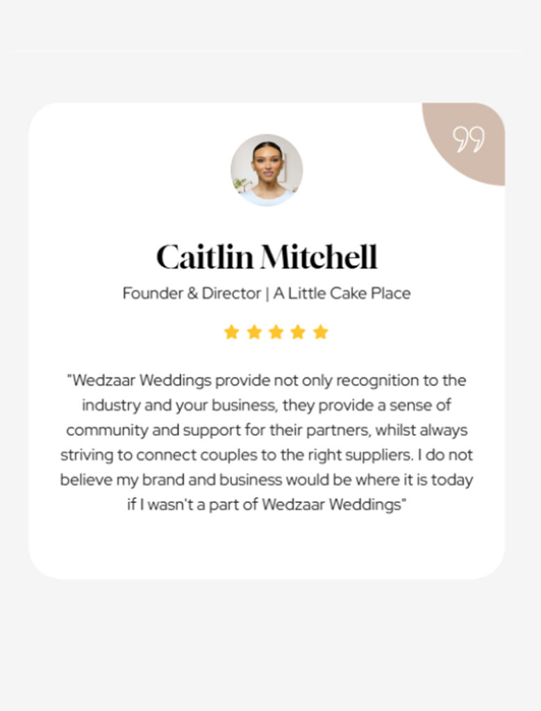 "Wedzaar Weddings provide not only recognition to the industry and your business, they provide a sense of community and support for their partners, whilst always striving to connect couples to the right suppliers. I do not believe my brand and business would be where it is today if I wasn't a part of Wedzaar Weddings"